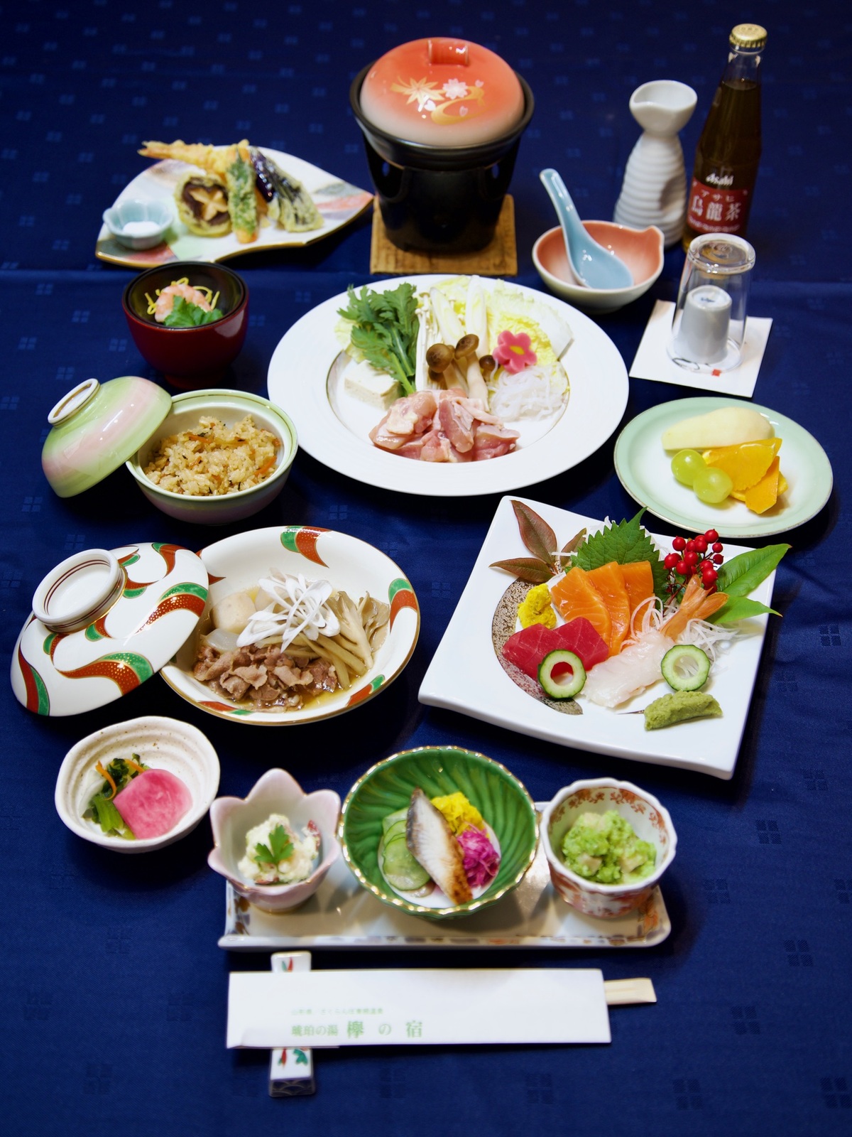 小鉢/お造り/鍋物(山形鶏チーズ豆乳鍋)/蓋物(山形名物芋煮)/揚物/凌ぎ/吸物/香物/水菓子
